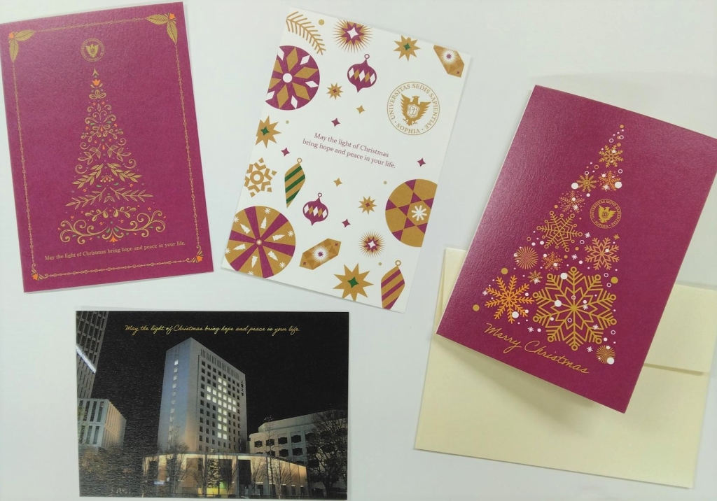 新商品の上智大学オリジナルクリスマスカードを販売します。 ポストカード3種とグリーティングカード1種をご用意しておりますので お気に入りのものを、どうぞお手に取ってご覧ください。 尚、商品の売上の一部はソフィアキャンパスサポートを通じて上智大学に寄付され、学生支援に活用されています。