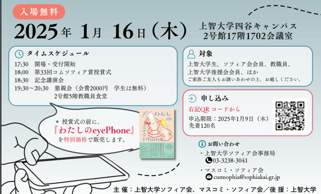 卒業生の皆様、ご多用とは思いますが、三宮さんのこれまでのご努力と今後ますますのご活躍を願い、是非ご一緒にお祝いいたしましょう。詳細をソフィア会HPより転載させていただきます。講演会・懇親会のお申込みは下記リンクまたはQRコードより、1月9日までにお願いいたします。