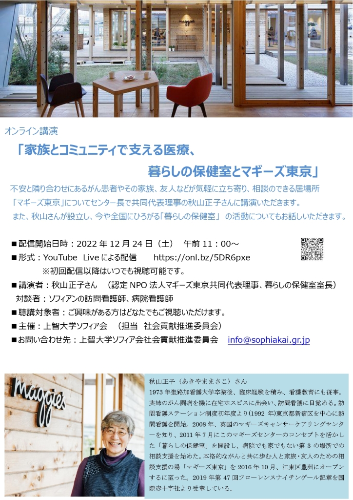 オンライン講演「家族とコミュニティで支える医療、暮らしの保健室とマギーズ東京」のお知らせ 2024 3/09 お知らせ 2022年11月30日2024年3月9日 上智大学ソフィア会(担当:社会貢献推進委員会)では以下の講演を12月24日午前11時より配信開始いたします。 お知らせ よかったらシェアしてね! URLをコピーしました! URLをコピーしました! マラウイ支援のご報告 社会貢献賞を受賞しました! この記事を書いた人 shakaikoken 関連記事 講演会『ゆるゆる多文化いとをかし~「ホッコリ」聞いてほしいこと』 2025年11月6日 ビデオ講演「ミャンマー人道危機とは何か」配信スタート! 2025年10月8日 学生団体STPカンボジアのクラウドファンディング 2025年5月8日 モンテッソーリスクールへの挑戦 2025年3月12日 ASF2025で皆さんの社会貢献活動/SDGs活動を紹介しませんか 2025年3月3日 ビデオ講演「誰もが、その人らしく生きられる社会をめざして」 ~細川佳代子さんの思いをつないで ~ 講演者:剱持睦子さん 2024年11月13日 葡萄の家グループホーム開所15周年記念演奏会『美しき古楽の調べ』のご案内 2024年10月1日 支援のお願い:Sophia Refugee Support Group クラウドファンディング 2024年7月14日